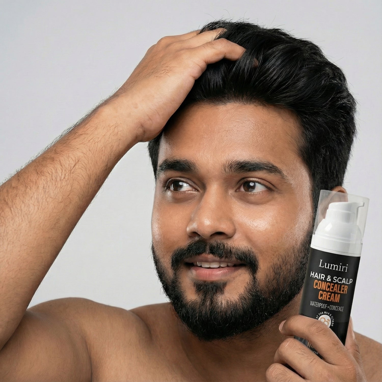 Not at all. Lumiri is made for Indian skin tones and blends smoothly into your scalp. No chalky finish, no makeup look — just natural-looking, fuller hair.